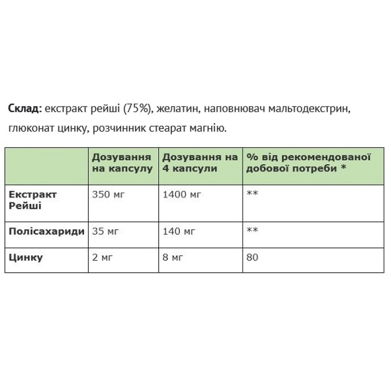 Экстракт гриба Рейши богатый витаминами (главным образом ВЗ, В5, С и D) и минералы (в частности, кальций, фосфор и железо). Рейши содержит активные среди целебных растений полисахариды.