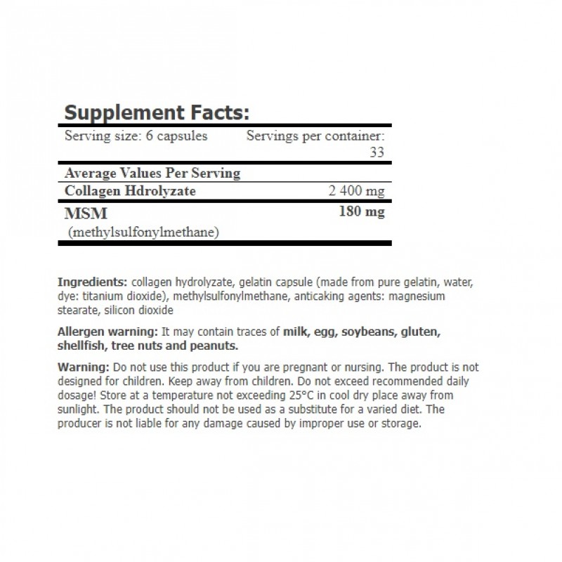 Ингредиенты: гидролизат коллагена, желатиновая капсула (из чистого желатина, вода, краситель: диоксид титана), метилсульфонилметан, противослеживающие агенты: стеарат магния, диоксид кремния