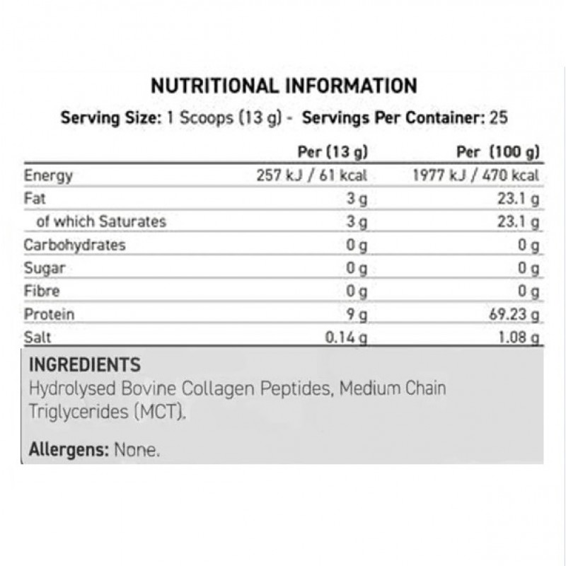Гидролизованные пептиды бычьего коллагена, триглицериды со средней длиной цепи (MCT).