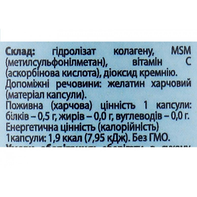 Состав: гидролизат коллагена, МСМ (метилсульфонилметан), витамин С (асорбиновая кислота), диоксид кремния.