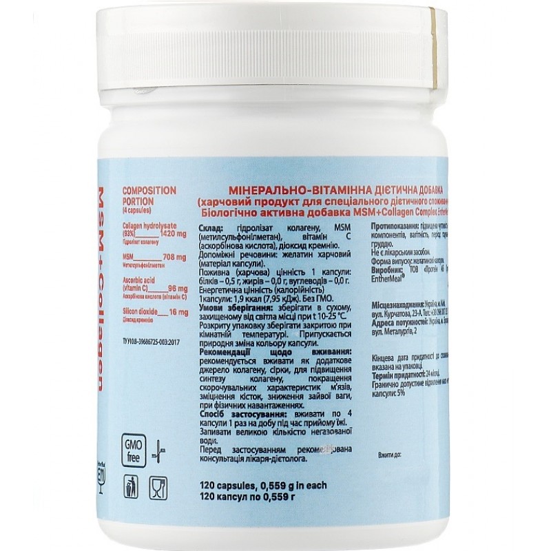 Комплекс MSM+Collagen хондропротектор - донатор серы. В основе комплекса лежит гидролизат коллагена животного происхождения, MSM (метилсульфонилметан) и витамин С. Коллаген обеспечивает организм аминокислотным сырьёем для синтеза коллагена, а МСМ (донатор серы) и аскорбиновая кислота создают условия для активизации этого синтеза.
