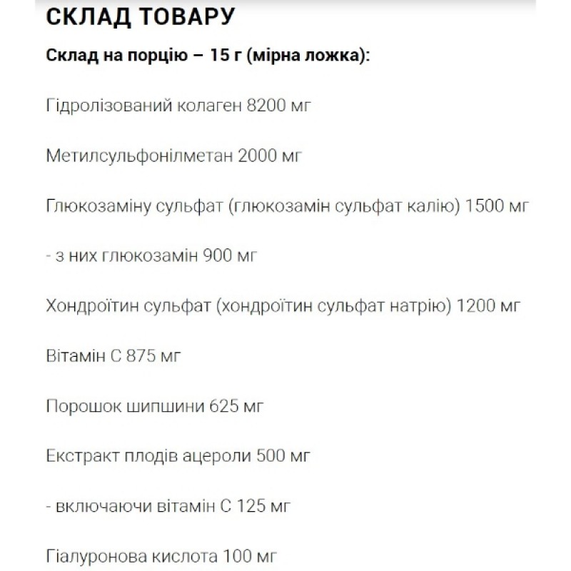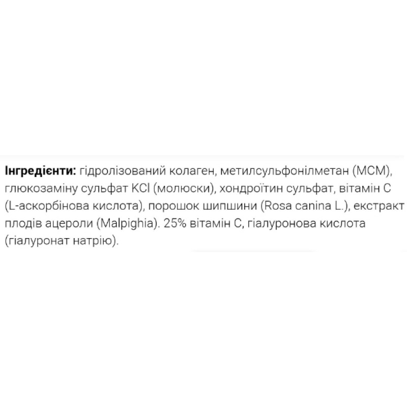 Продукт представляет собой продуманную комбинацию солидной порции гидролизованного коллагена с гиалуроновой кислотой, хондроитином, глюкозамином, МСМ и витамином С.