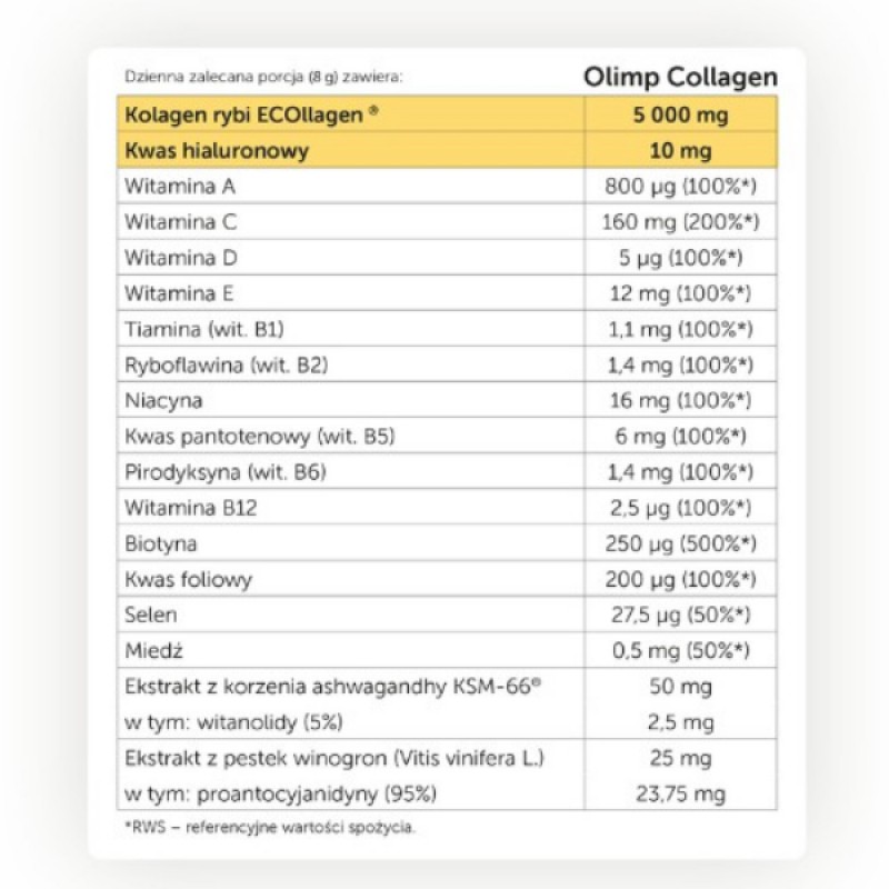 Olimp Collagen - это формула, богатая активными ингредиентами, в том числе высококачественным, прекрасно усваиваемым гидролизатом рыбьего коллагена ECOllagen®, которая помогает поддерживать здоровый вид кожи, волос и ногтей, а также здоровье суставов и связок.