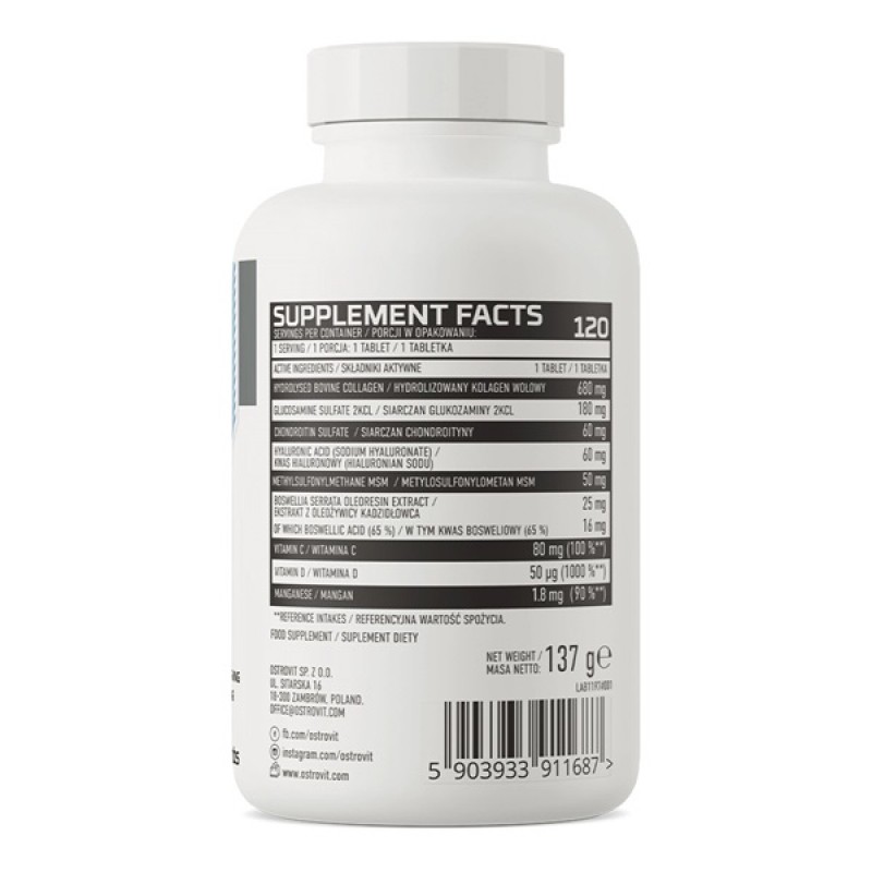 Коллаген — один из основных строительных белков организма, природный полимер и важный компонент межклеточного вещества животных организмов. Гидролизованный бычий коллаген, используемый в препарате OstroVit, характеризуется очень высокой биодоступностью, то есть он легко усваивается в пищеварительной системе человека. Глюкозамин органическое химическое соединение, которое является аминным производным глюкозы. Синтез этого вещества в организме человека происходит в незначительных количествах, и с возрастом способность к его выработке снижается. Тем не менее, это соединение может поступать в организм с пищей — глюкозамин содержится в морепродуктах, в хитиновом панцире ракообразных, а также в виде пищевых добавок.