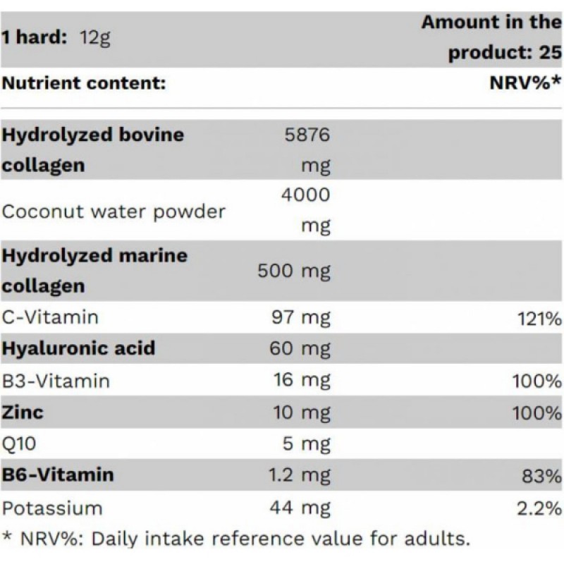 - Напиток содержит не только говяжий и рыбный коллаген, но и гиалуроновую кислоту, Q10, цинк и витамины С и В6.