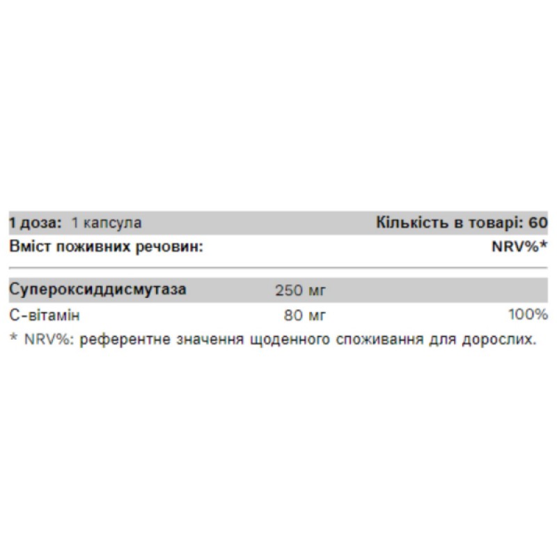 Помимо все более популярного фермента супероксиддисмутазы, этот продукт также содержит количество витамина С, равное 100% дневной нормы, что помогает поддерживать нормальное состояние кожи, зубов, десен, хрящей, кровеносных сосудов и способствует к норме для образования коллагена.