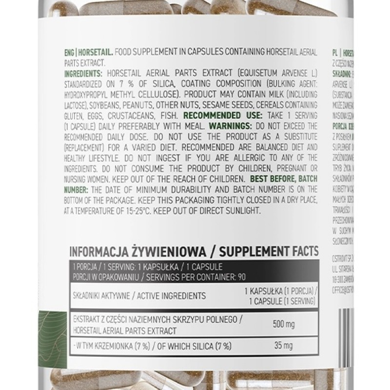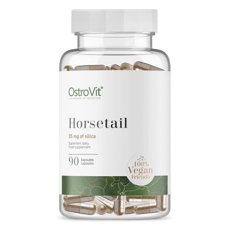 OstroVit HorseTail VEGE — это современная пищевая добавка в капсулах, содержащая экстракт из молотых частей хвоща полевого. Продукт создан для вегетарианцев и веганов, так как продукт не содержит веществ животного происхождения, а основной ингредиент капсул, которым обычно является желатин, заменен на целлюлозу ГПМЦ. Несмотря на то, что хвощ широко известен как растение, способствующее росту волос и ногтей, его целебное действие гораздо шире. Кремнезем, содержащийся в экстракте, влияет, в частности, на работу почек, надпочечников и сердца.