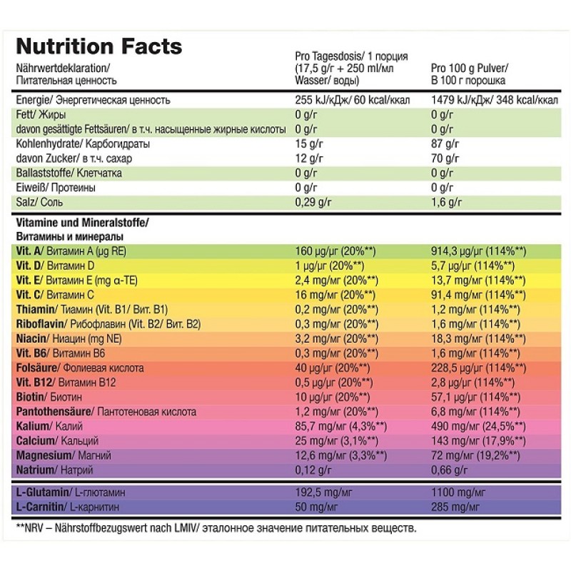Ингредиенты: сахар, мальтодекстрин, глюкоза, фруктоза, регуляторы кислотности: лимонная кислота, яблочная кислота; минералы (хлорид натрия, калийная соль ортофосфорной кислоты, кальциевая соль ортофосфорной кислоты, цитрат натрия, карбонат магния), загустители: гуммиарабик, ксантановая камедь, натриевая соль карбоксиметил целлюлозы; ароматизаторы, L-глютамин, L-карнитин L-тартрат, витамины (L-аскорбиновая кислота - витамин С, DL-альфа-токоферола ацетат - витамин Е, никотинамид - ниацин, D-биотин, ретинола ацетат - витамин А, кальция D-пантотенат - пантотеновая кислота, пиридоксина гидрохлорид - витамин В6, холекальциферол - витамин D, птероилмоно глютаминовая кислота - фолиевая кислота, тиамина мононитрат - витамин В1, рибофлавин - витамин В2, цианокобаламин - витамин В12), подсластители: ацесульфам калия, сукралоза, цикламаты; краситель: рибофлавин.