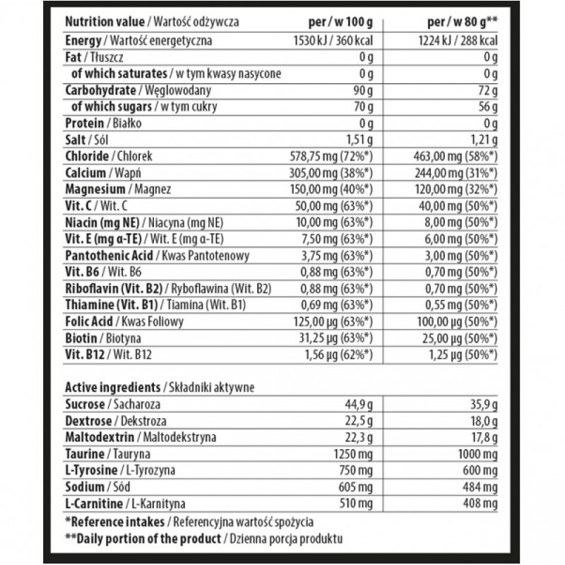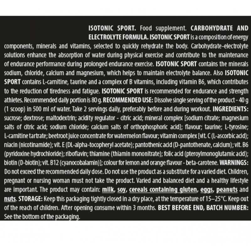 ISOTONIC SPORT — это комплекс энергетических компонентов, минералов и витаминов, подобранных для быстрого восстановления водного баланса организма. Углеводно-электролитные растворы усиливают всасывание воды при физических нагрузках и способствуют поддержанию выносливости при длительных упражнениях на выносливость. ISOTONIC SPORT содержит минералы кальция натрия, хлорида, а также магния, которые помогают поддерживать электролитный баланс. Также ISOTONIC SPORT содержит L-карнитин, таурин и комплекс витаминов группы В, в том числе витамин В6, что позволит восстановить быстрее высокий уровень энергии. Подходит спортсменам, занимающимся упражнениями на выносливость и силовыми видами спорта.