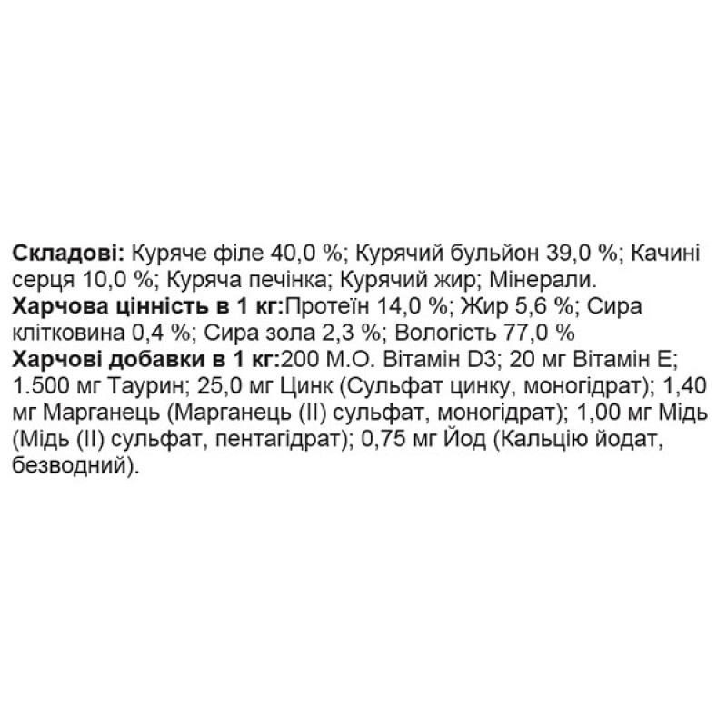 - Содержит единственный источник животного белка — куриное филе, богатое незаменимыми аминокислотами, витаминами РР, А, группы B и важными минералами, например, калием, серой, фтором, кальцием, магнием, натрием, фосфором, йодом, цинком, медью и т. д.