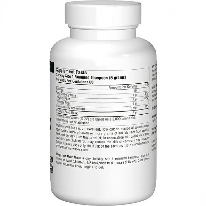 Шелуха оболочек семян подорожника является прекрасным, низкокалорийным источником растворимых пищевых волокон. Употребление семи или более грамм продукта с растворимой клетчаткой из шелухи семян подорожника в день, в сочетании с диетой с низким содержанием насыщенных жиров и холестерина, может снизить риск развития ишемической болезни сердца. Source Naturals использует только шелуху семян, так как в ней содержится больше волокон, чем в самих семенах.