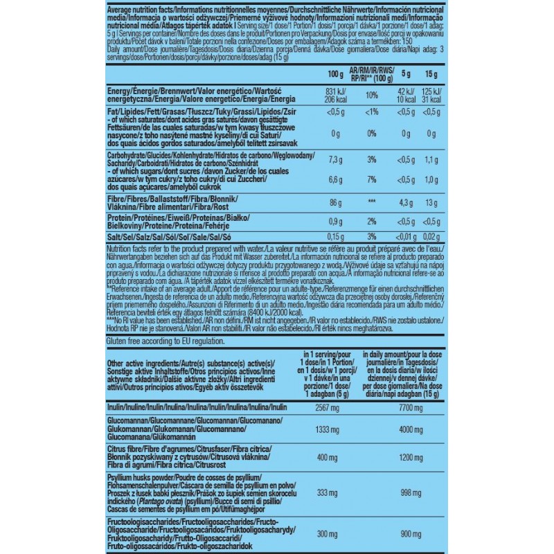 инулин 51,3%, глюкоманнан 26,7% (из корневого клубня Amorphophallus konjac) (с содержанием диоксида серы), цитрусовое волокно 8%, порошок шелухи подорожника 7% (из семян Plantago ovata), фруктоолигосахариды 6%, антислеживатель (диоксид кремния). Изготовлено на предприятии, производящем также продукты, содержащие молоко, яйца, сою, ракообразных, диоксид серы и орехи. Может содержать следы люпина, семян кунжута и горчицы.