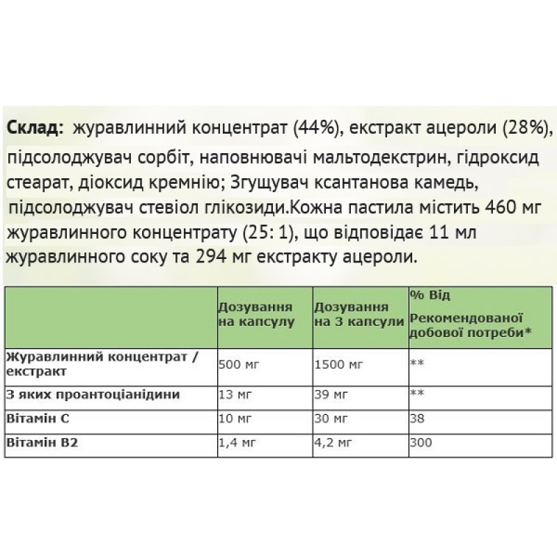 Экстракт плодов клюквы - благодаря высокому содержанию проантоцианидины имеет высокую противовоспалительную активность. Обладает антиоксидантными и общеукрепляющими свойствами, которые обусловлены содержанием витамина С.