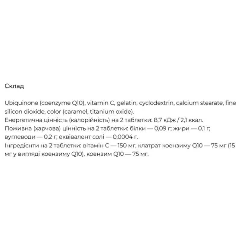 Комплекс сочетает в себе коэнзим Q10, витамин С и другие ценные микроэлементы, которые дарят заряд жизненной энергии, поднимают тонус организма, устраняют признаки усталости, способствуют укреплению иммунитета, нормализуют работу сердечно-сосудистой системы и нормализуют вес тела.