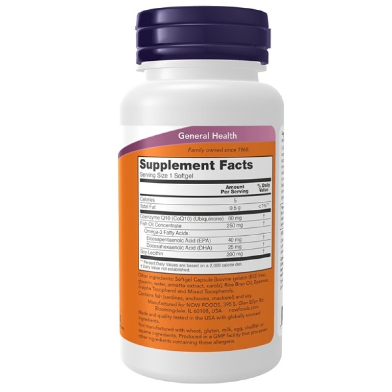 Комплекс NOW CoQ10 60mg with Omega-3 Fish Oil соединяет в себе преимущества коэнзима Q10 и омега-3. Благодаря такому составу вы в первую очередь улучшите работу своего сердца, поскольку омега-3 известны тем, что уменьшают уровень холестерина в крови и способствуют понижению кровяного давления. Ну, а коэнзим Q10 наладит более эффективное обеспечение сердца энергией. Ведь данное соединение известно тем, что участвует в производстве клеточной энергии.