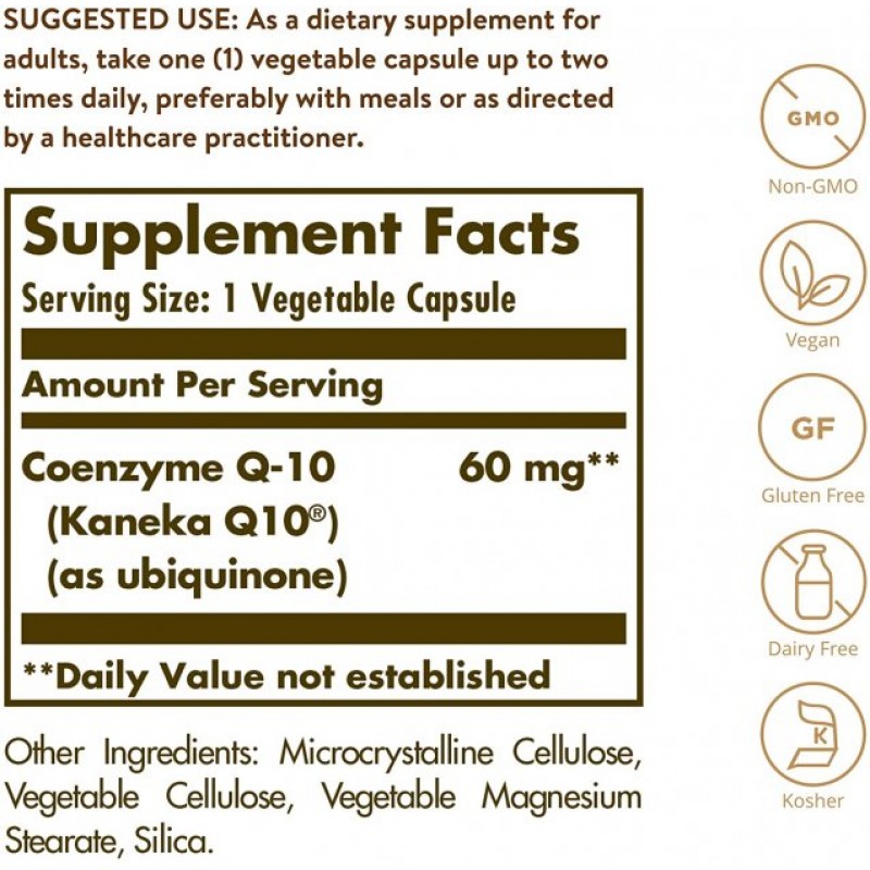 Коэнзим Q10 вегетарианский, CoQ-10, Solgar - пищевая добавка, содержащая жирорастворимый кофермент убихинон. Убихинон обеспечит антиоксидантную защиту митохондрии, поддержит выработку энергии в клетках для оптимального функционирования организма, снижения усталости и повышения физической выносливости. Добавка дает возможность поддержки уровня коэнзима и предотвращения его дефицит в любом возрасте. Применение коэнзима способствует торможения процессов старения, нейтрализует негативное действие свободных радикалов и пагубное действие окружающей среды. Коэнзим положительно действует на работу сердечно-сосудистой системы, способствует поддержки нормального АД, особенно при гипертонии. Коэнзим Q10 обеспечит нормальное функционирования головного мозга, особенно в пожилом возрасте, благодаря своим антиоксидантным свойствам и торможению строения клеток мозга. А также коэнзим благоприятно действует на работу нервной и иммунной систем. Добавка Коэнзим Q10 также подойдет для употребления веганам, вегетарианцам.