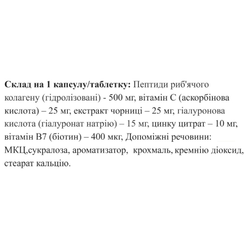 - Пептиды рыбьего коллагена (гидролизованные) (500 мг): Основной компонент для поддержания эластичности и прочности кожи.