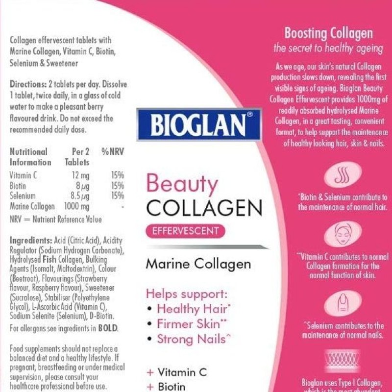 Bioglan Beauty Collagen Effervescent – это восхитительные шипучие таблетки с легко усваиваемым гидролизованным морским коллагеном, а также тщательно подобранными витаминами и минералами, которые помогают поддерживать здоровый вид волос, кожи и ногтей. Просто добавьте его в бутылку с водой или стакан воды.