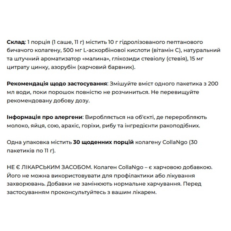 Рекомендуемый курс: 3 месяца по 1 порции CollaNgo ежедневно, после завершения приема - 1 месяц перерыва. После этого курс повторить.