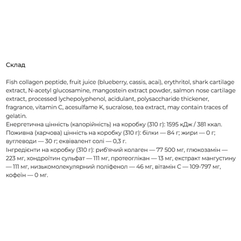 Комплекс также содержит дополнительные микроэлементы, свойства которых направлены на обеспечение красоты и молодости: глюкозамин, хондроитин, витамин С, протегликан, низкомолекулярные полифенолы.