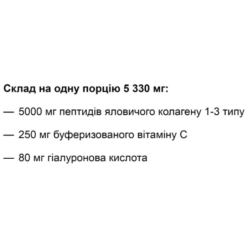 Каждая порция содержит высокую концентрацию коллагена - целых 5330 мг! Это помогает восстановить структуру и эластичность кожи, уменьшить морщины и придать лицу молодой и сияющий вид. Гиалуроновая кислота в сочетании с витамином С обеспечивает глубокое увлажнение и защиту от окружающей среды.