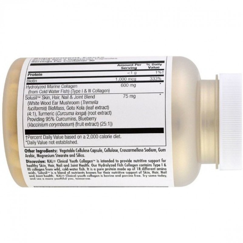 Clinical Youth Collagen от KAL предназначен для обеспечения питательной поддержки здоровой кожи, волос и суставов. Наш гидролизованный коллаген содержит коллаген типа I и типа II, полученный из обитающие в холодных морских водах рыбы. Это чистый протеин, состоящий из 18 различных аминокислот. Solusil - это смесь питательных веществ, известных своей природной способностью поддерживать кожу, волосы и ногти, а также суставы. Clinical Youth Collagen от KAL не содержит бовина и порцина. Попробуйте наш продукт уже сегодня и уже завтра вы увидите более молодого себя перед зеркалом.