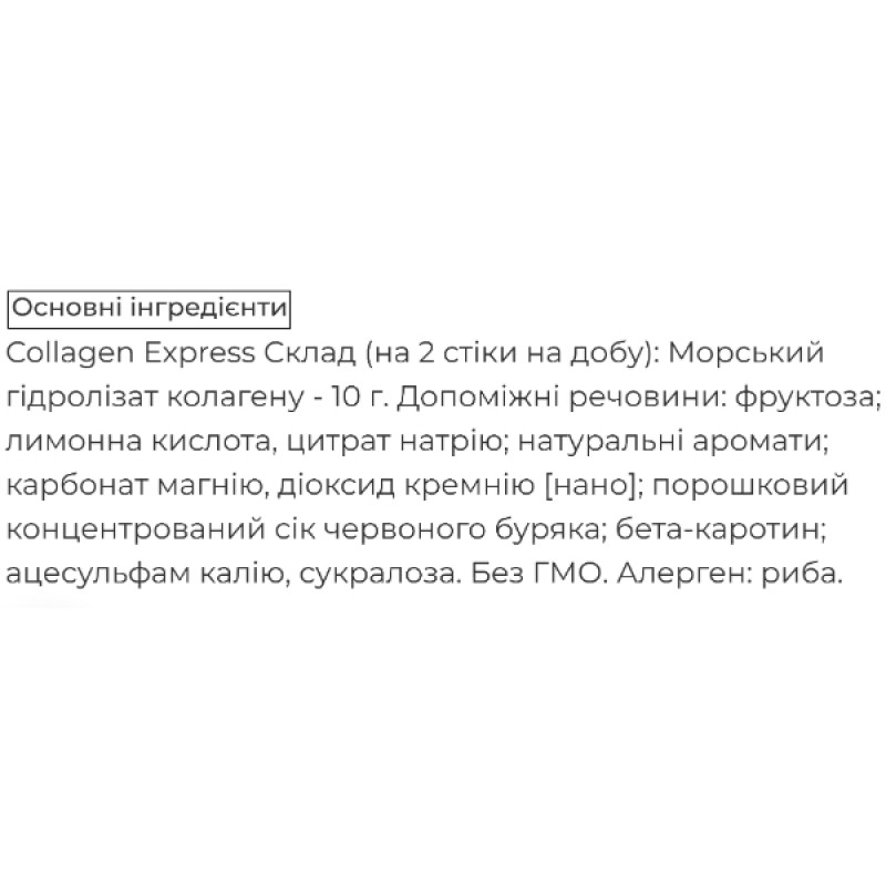Collagen Express: 1-2 стика в день (во время приема пищи), предварительно растворив в стакане воды комнатной температуры. Не превышайте рекомендуемую суточную дозу. Продолжительность применения: 5 дней. Курс можно продолжить на 30-90 дней.