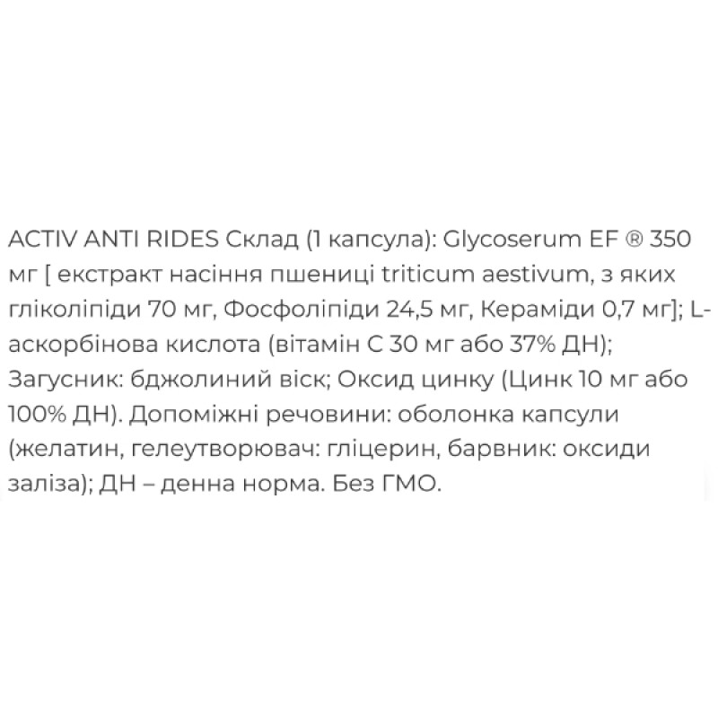 ACTIV ANTI RIDES: взрослым принимать по 1 капсуле в день, желательно утром во время приема пищи, запивая большим стаканом воды комнатной температуры. Продолжительность применения: 30 дней. Курс можно продолжить на 30-90 дней.