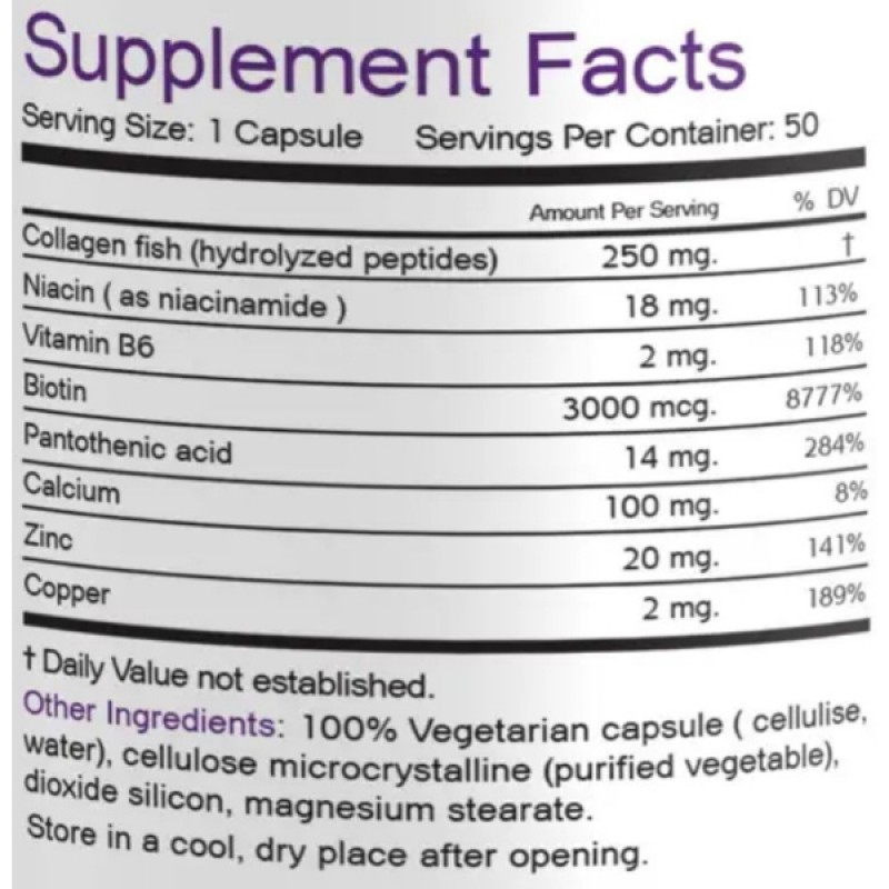 Комплекс Кожа, волосы, ногти снабжает питательными веществами, необходимыми для производства коллагена и кератина, что помогает в поддержании сильных волос, крепких ногтей и влажной эластичной кожи.