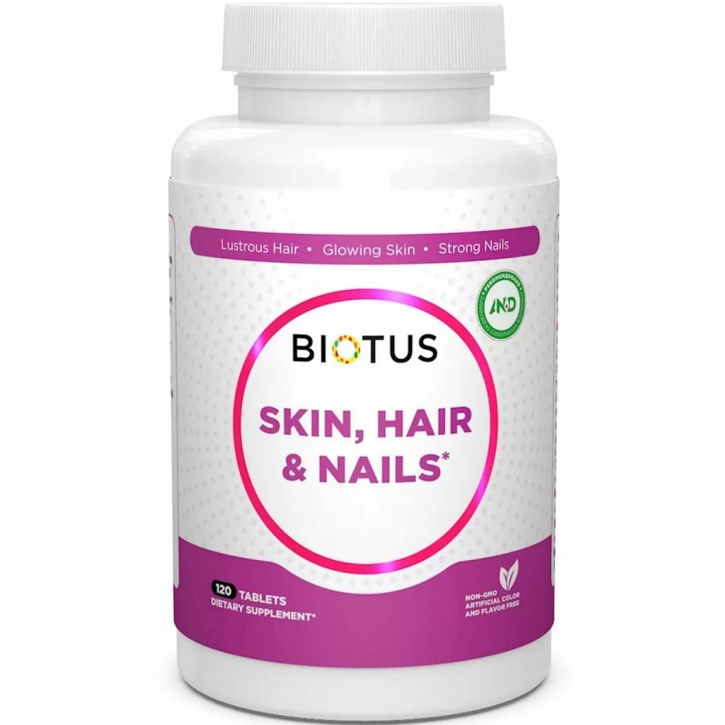 Волосы, кожа и ногти, Hair, Skin & Nails, Biotus — это пищевая добавка от украинского производителя, которая является источником биологически активных веществ, предназначенных для улучшения состояния кожи, волос, ногтей. Метилсульфонилметан, один из компонентов этой добавки, является природным источником органической серы. Сера имеет антибактериальные свойства, обеспечит улучшение состояния кожи, особенно при наличии купероза и прыщей. МSM способствует снижению воспалений, а также ускорению заживлению кожи. МSM способствует дополнительному выработку коллагена и кератина, белков, из которых состоят эпидермис кожи, и необходимых для улучшения структуры волос. Витамин С в форме L- аскорбиновой кислоты имеет мощные антиоксидантные свойства. Он участвует в синтезе коллагена, обеспечит клеточное обновление, предупредит появление пигментных пятен, морщин, способствует улучшению внешнего вида кожи, избавляя от сухости. Диоксид кремния способствует выработке коллагена, который обеспечит улучшение организма не только снаружи, но и изнутри. Кремний предотвратит выпадение волос, способствует улучшению толщины и эластичности волос, ногтей. Кроме этого, кремний обеспечит повышение способности организма к сопротивлению и борьбе с бактериями, микроорганизмами и грибками. Аминокислоты пролин и L-лизин также участвуют в синтезе коллагена, способствуют ускорению регенерации поврежденных тканей, укреплению волос и ногтей. Цинк — это важный минерал, который предотвратит ломкость ногтей и волос, а также положительно действует на состояние кожи, способствуя восстановлению ее упругости и эластичности. Медь в составе не менее важна. Она необходима для улучшения состава крови для ускорения обменных процессов и производства коллагена и эластина. Пищевая добавка от Biotus способствует улучшению состояния кожи, повышению ее упругости, торможению процессов старения, защите от пагубного воздействия УФ-лучей; укреплению структуры волос, возвращению блеска и упругости волос; предотвращению ломкости ногтей и уплотнению пластины. Также прием добавки обеспечит укрепление всего организма и улучшение самочувствия.