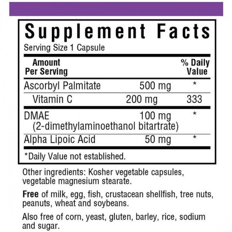 Комплекс содержит пять основных ингредиентов, которые вместе питают кожу и поддерживают ее здоровой. Аскорбил пальмитат, краеугольный компонент, представляет собой жирорастворимый витамин С, который способствует здоровой антиоксидантной активности в коже и поддерживает целостность коллагена. Альфа-липоевая кислота - мощный жиро- и водорастворимый антиоксидант, который помогает рециркулировать антиоксидантные витамины С и Е. В качестве антиоксиданта витамин С разрушает свободные радикалы, которые могут повредить волосы, кожу и ногти. В формуле также содержится DMAE, который повышает упругость кожи.