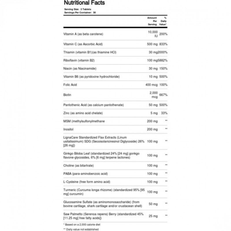 В состав входит витамины группы В, которые комплексно воздействуют на здоровье волос. Витамин В2 укрепляет волосы. Препятствуя возникновению ломкости и сухости. Витамин В3 укрепляет естественную пигментацию волос, таким образом сохраняет цвет и препятствует возникновению седины. Витамин В6 и витамин А оздоравливают кожу головы, препятствуя возникновению перхоти и чувства стянутости. Витамин В9 ускоряет рост волос, а витамин В7 препятствует их выпадению.