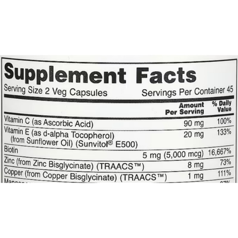 Эта абсолютно веганская формула содержит ключевые аминокислоты и микроэлементы, необходимые для синтеза коллагена и кератина, основных строительных блоков волос, кожи и ногтей. Кроме того, она насыщена антиоксидантами витамина C и E, эффективно защищающими кожу от негативного воздействия свободных радикалов. Также в составе есть биотин и гиалуроновая кислота, которые поддерживают здоровье и молодость кожи, делая ее упругой и гладкой.