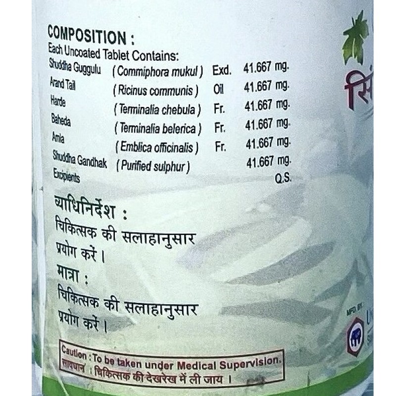 Традиционно Sinhanad Guggulu применяют также в лечении различных заболеваний кожи. Таких как псориаз, экзема и другие. В комплексной терапии используется в качестве вспомогательного средства при острых респираторных инфекциях. Понижает Питта и Вата Доши.
