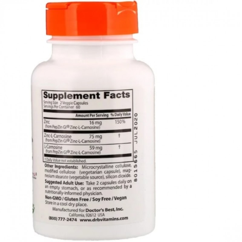 PepZin GI» от Doctor's Best — это комплекс цинка и L-карнозина, которые обеспечивают превосходный результат, действуя сообща. Запатентованный процесс хелатообразования, используемый при производстве PepZin GI, обеспечивает долгосрочную поддержку здорового функционирования желудка. Препарат способствует здоровой секреции желудочных клеток и обеспечивает бактериальное равновесие в ЖКТ.