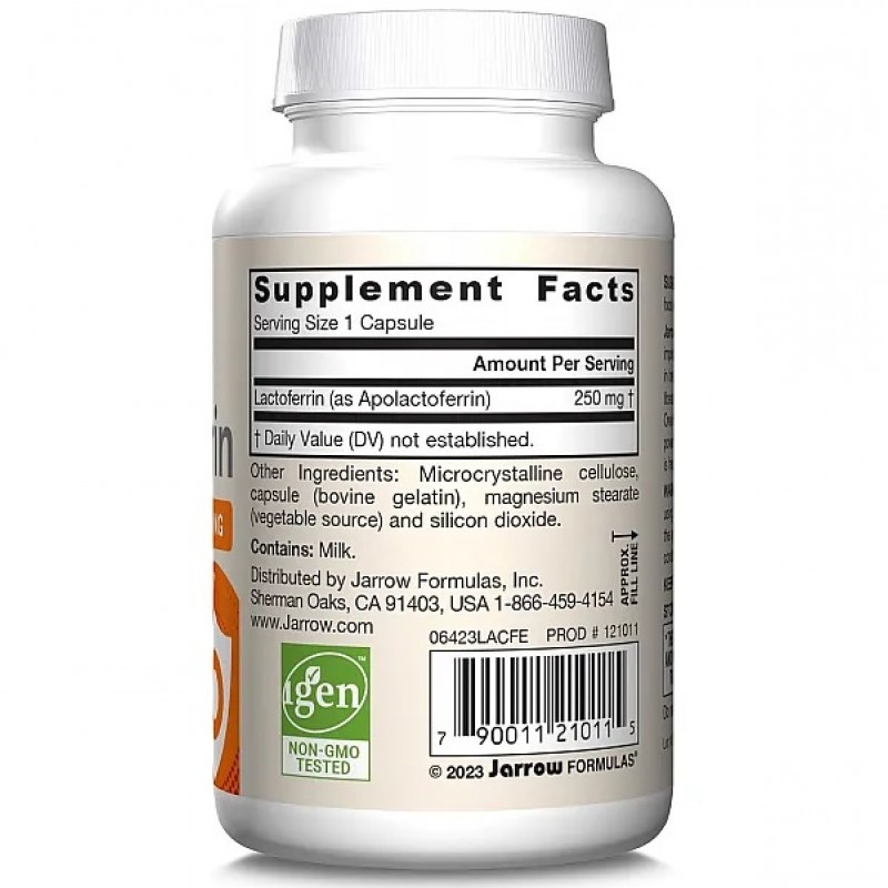 Jarrow Formulas® Lactoferrin (аполактоферрин) - важный поддерживающий иммунитет гликопротеин, который содержится в грудном молоке, слезах и других жидкостях организма. Одна из биологических активностей лактоферрина связана с его мощной способностью связывать железо (в 300 раз больше, чем в сывороточном трансферрине), что способствует росту полезных бактерий. Кроме того, переваривание лактоферрина желудочным пепсином высвобождает иммунный поддерживающий пептид лактоферрицин В.