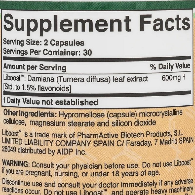 Double Wood Supplements Liboost For Women 600 mg — это полностью натуральный и запатентованный экстракт дамианы (Turnera diffusa), стандартизованный до >= 1,5% биофлавоноидов. Листья растения дамиана имеют долгую историю использования в медицинской практике Южной Америки в качестве афродизиака и добавки для сексуальной поддержки.