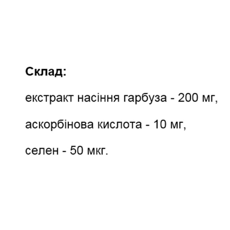 Экстракт семян тыквы содержит комплекс биологически активных добавок (жиры, углеводы, органические кислоты, соли фосфорной и кремниевой кислот, каротин, фолиевая, пантотеновая, никотиновая, аскорбиновая кислоты, минералы: калий, кальций, цинк, магний, фосфор, железо; фитостерин, фитин, лейцин, тирозин, лецитин) и ситостерин, который отвечает за предупреждение развития рака. Наличие комплекса жирорастворимых витаминов, который состоит из витаминов А, Е и F (витамин F представлен смесью полиненасыщенных жирных кислот - олеиновой, линолевой и линоленовой), тормозит повышение содержания холестерина и триглицеридов в крови, препятствует развитию атеросклероза и других функциональных нарушений сердечно-сосудистой системы.