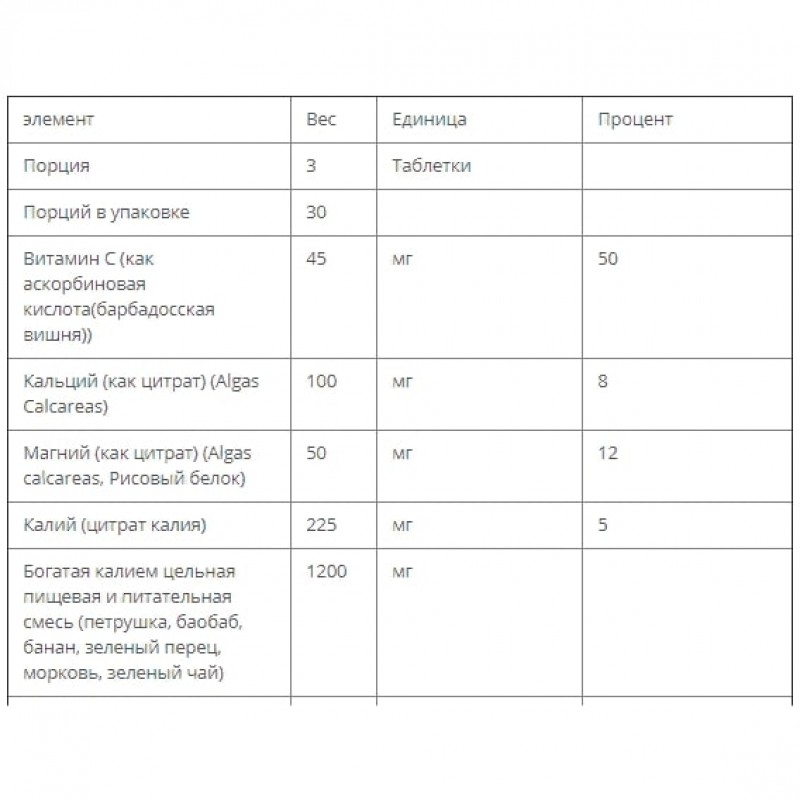 микрокристаллическая целлюлоза, растительная целлюлоза, стеариновая кислота, стеарат магния, диоксид кремния, ацерола , кальций Algas, рисовый белок, гидроксипропилметилцеллюлоза и фармацевтическая глазурь.