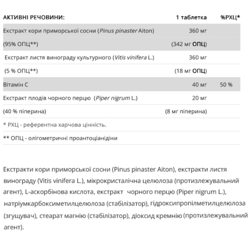 В экстракте коры приморских сосен содержатся биологически активные вещества – олигометрические проантоцианидины. Эти вещества помогают поддерживать нормальное состояние стенок кровеносных сосудов и кровообращение.
