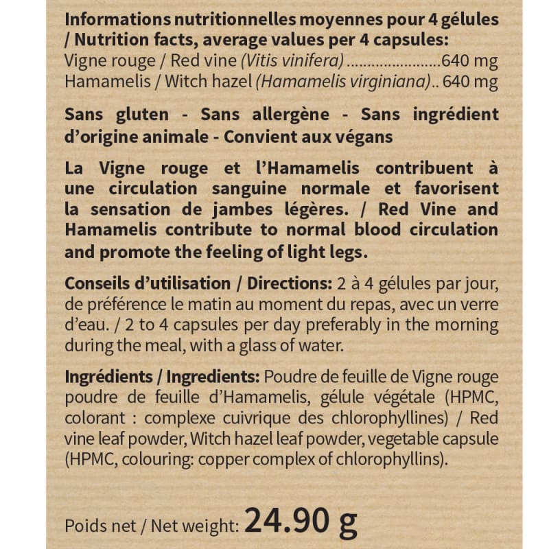 Ингредиенты: порошок листа красной виноградной лозы, титрованный в полифенолы, порошок листа гамамелиса, растительная капсула (HPMC, краситель: медные комплексы хлорофиллинов).