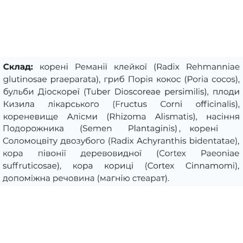Плоды Кизила являются природным источником декстрозы. Корневище Алисмы, гриб Пория кокос, Соломоцвет двузубый способствуют регуляции количества жидкости в организме, а также позитивно воздействуют на функции гепатобилиарной системы. Сочетание редких растительных компонентов способствует нормализации работы почек, поджелудочной железы, а также сердечно-сосудистой системы.