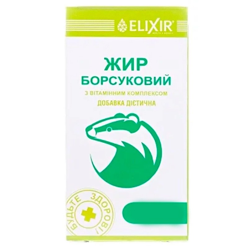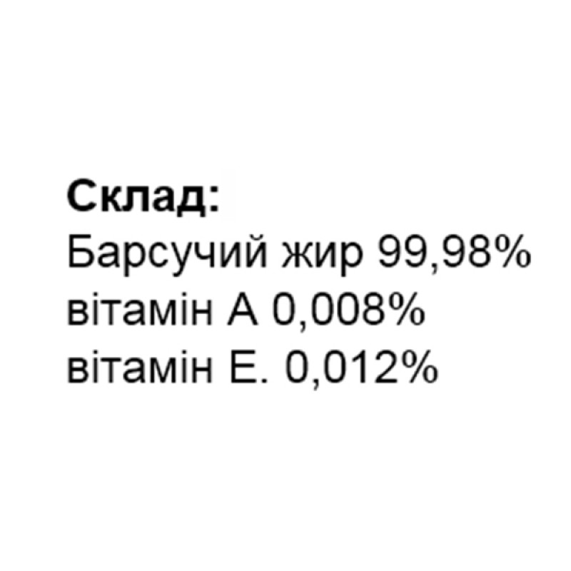 «Борсучий жир с витаминным комплексом» – ценный пищевой продукт. Он содержит более 86% ненасыщенных жирных кислот, необходимых для полноценной жизнедеятельности человеческого организма (Омега-3 и Омега-6), витамины А, В2, В5, В6, В12, D, РР, Е, каротин, фолиевая кислота, пектины, сапонины. При приеме внутрь барсучий жир полностью усваивается в кровь, обогащая ее витаминами, необходимыми организму микроэлементами и органическими кислотами, усиливает белковый обмен, повышает иммунитет организма, регулирует работу кроветворительной системы, оказывает бактерицидное действие на туберкулезные бациллы. При регулярном употреблении нормализуется секреторная деятельность желудка и кишечника, повышается эмоциональный тонус, погашаются гнойные процессы.