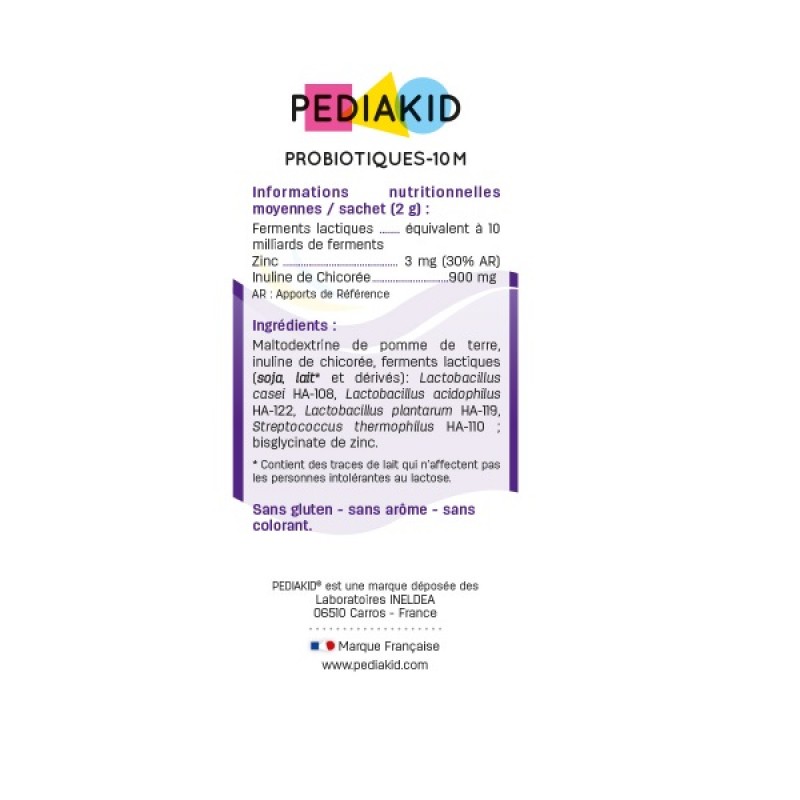 PROBIOTIQUES - 10m - порошок Пробиотика для детей с лактоферментами, волокнами инулина цикория и биодоступным цинком. Возобновляет микрофлору кишечника. 1 пакетик обеспечивает организм 10 миллиардами лактоферментов (Lactobacillus casei, Lactobacillus acidophilus, Lactobacillus plantarum, Streptococcus thermophilus), штаммов, которые наилучшим образом возобновляют баланс кишечной микрофлоры. Он также содержит инулин цикория для ускорения роста полезных бактерий в кишечнике и бисглицинат цинке, который повышает иммунитет.