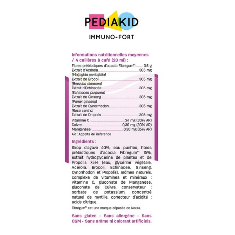 IMMUNO - FORT - натуральное питьевое средство для детей на основе нектара агавы, пребиотиков и экстрактов корня эхинацеи, корня женьшеня, плодов шиповника, плодов ацероли, листьев брокколи; с прополисом, витамином С, марганцем и медью. Вкус: черника. Способствует укреплению защитных сил организма. От 6 месяцев до 15 лет.