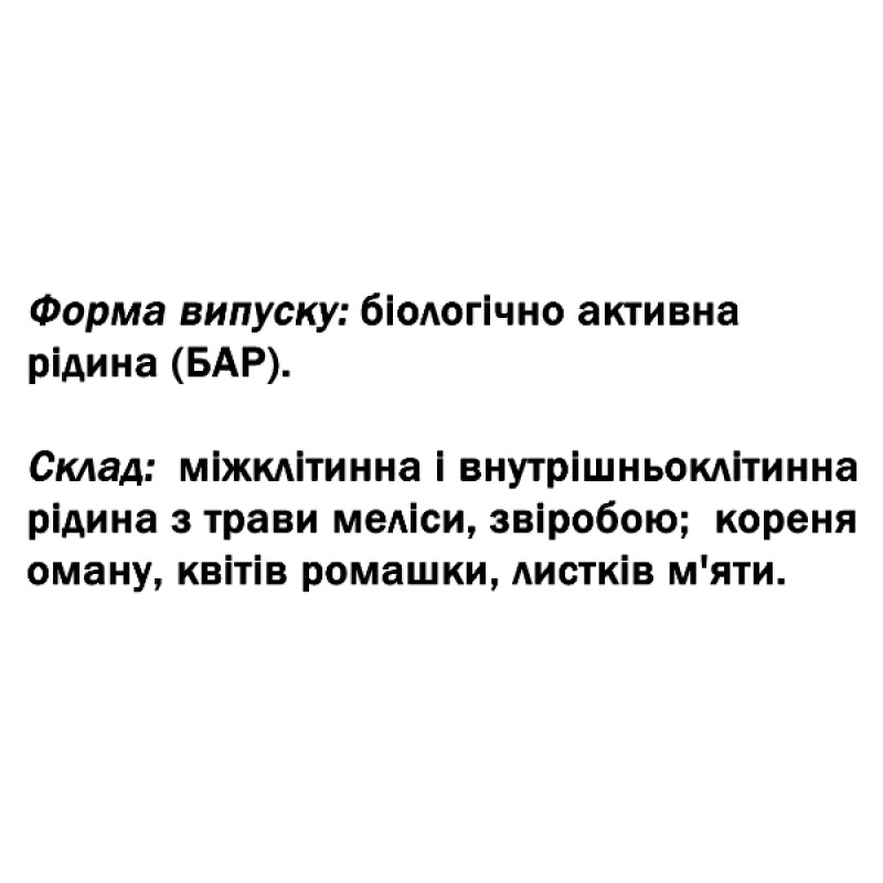 Биоактивная жидкость не содержит консервантов, спиртов, гормональных стимуляторов, не имеет жестких противопоказаний. Не вызывает сонливости, не влияет на скорость реакции при управлении транспортным средством или работе с механизмами. Является 100% натуральным препаратом.