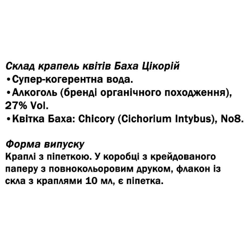 Цветок Баха Chicory помогает признать безусловную природу истинной любви. Любовь нельзя купить. Это также не инструмент силы, с помощью которого можно кого-то принудить. Чистая любовь не предъявляет никаких требований типа «Я люблю тебя, только если…». Всё это важные мысли, к которым можно прийти с помощью применения этих капель. Оставьте расчетливую и удушающую заботу позади и найдите самоотверженное и уважительное внимание вместе с №8 Chicory.