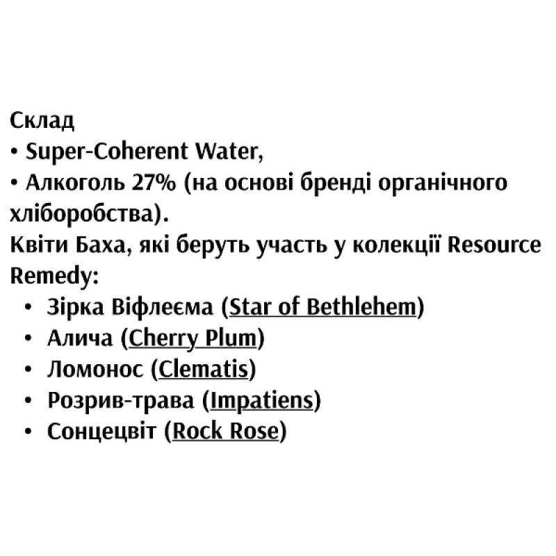 Resource Remedy — коллекция доктора Э. Баха (1886-1937) из 5 взаимодополняющих цветов для ситуаций эмоционального стресса. Капли произведены по оригинальному рецепту Баха, Национальным лидером диет-добавок Италии Компанией GUNA (Милан) по стандартам GMP на супер-когерентной воде (WHITE).