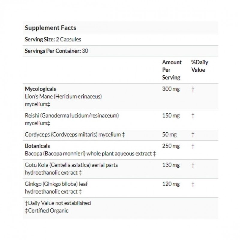 Формула для мозга (Brain), Fungi Perfecti - это смесь грибов и трав. Используется активированный сублимированный сертифицированный органический грибной мицелий со всеми его ингредиентами, незаменимыми для естественной поддержки иммунитета. Добавление сертифицированных органических трав, тщательно отобранных для дополнения полезных свойств грибов, обеспечивает предоставление лучшего из двух миров. Не содержит глютена, ГМО, вегетарианский продукт.