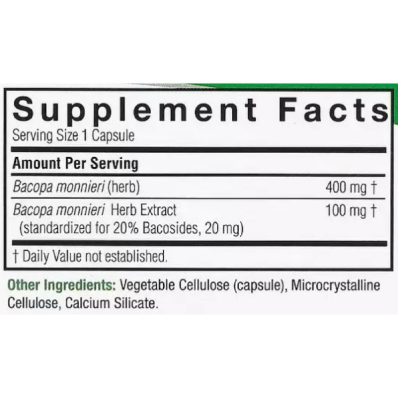 Травянистое растение Бакопа Монье имеет широкое применение в Аюрведе. В своем составе Бакопа содержит флавоноиды, бакозиды, железо, фосфор, аскорбиновую кислоту, кальций, алколоиды. Пищевая добавка от Nature's Answer представлена в виде экстракта, который производится согласно эталонным стандартам, разработанным для более 800 видов растений. Каждый флакон препарата проходит более 100 различных этапов проверок качества. На предприятии используются методы экстракции, которые позволяют сохранить естественный баланс растения. Можно купить экстракт бакопы с полной уверенностью в подлинности состава, так как компания Nature's Answer контролирует весь производственный процесс. В экстракте содержится до 20% бакозидов, которые проявляют антиоксидантное действие.